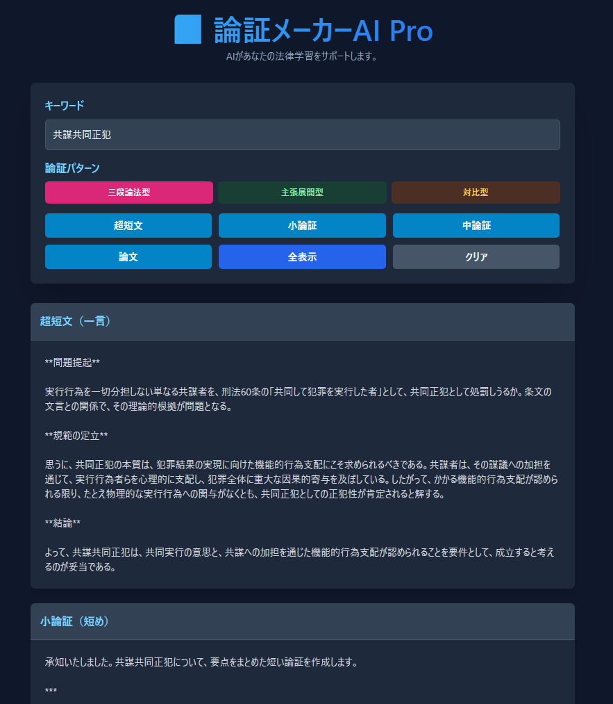 「短時間で多角的な論証を比較できるのがとても便利。AIproの“全表示機能”は、構成理解に直結します。