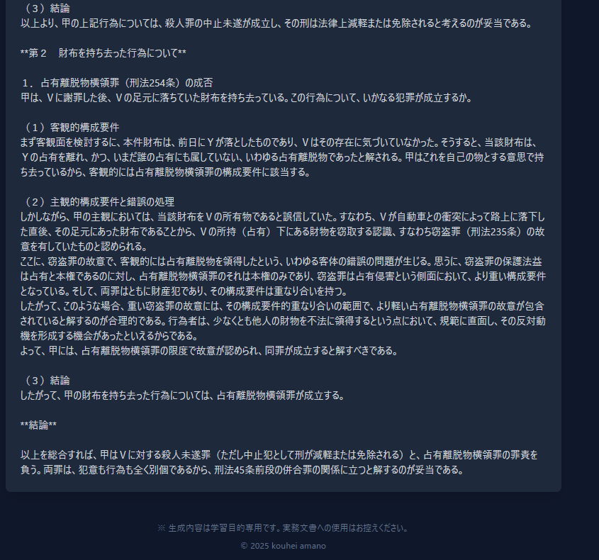 「“構成迷子”だった私が、AIproで初めて“論文が書けた!”という感覚を得ました。特に刑法の中止犯の論理展開が一瞬で理解できて感動しました。」